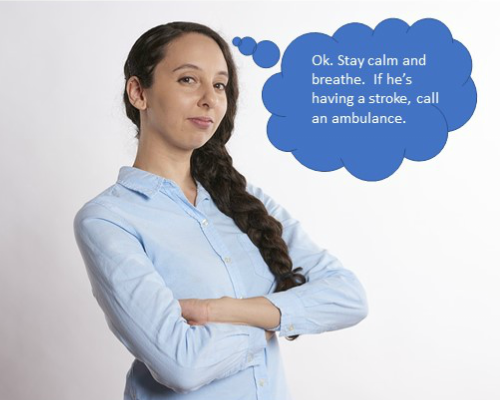 You stare for a couple of seconds at him. You recognize gibberish when you hear it. In a knee jerk reaction, you create a tightened, worried feeling starting from your gut and move it up into your throat. The first thought that comes to your mind is one word: stroke?